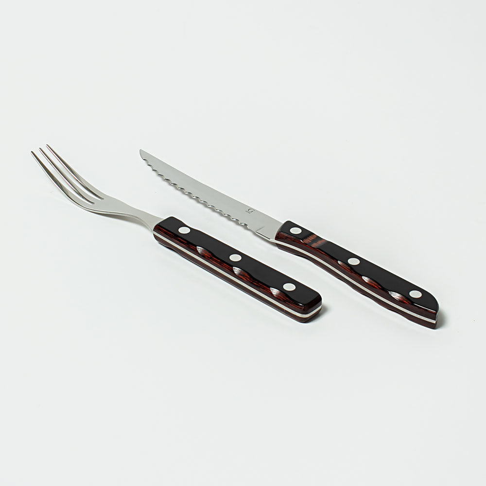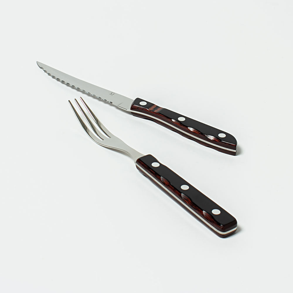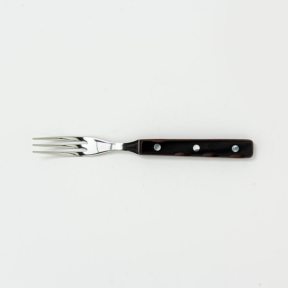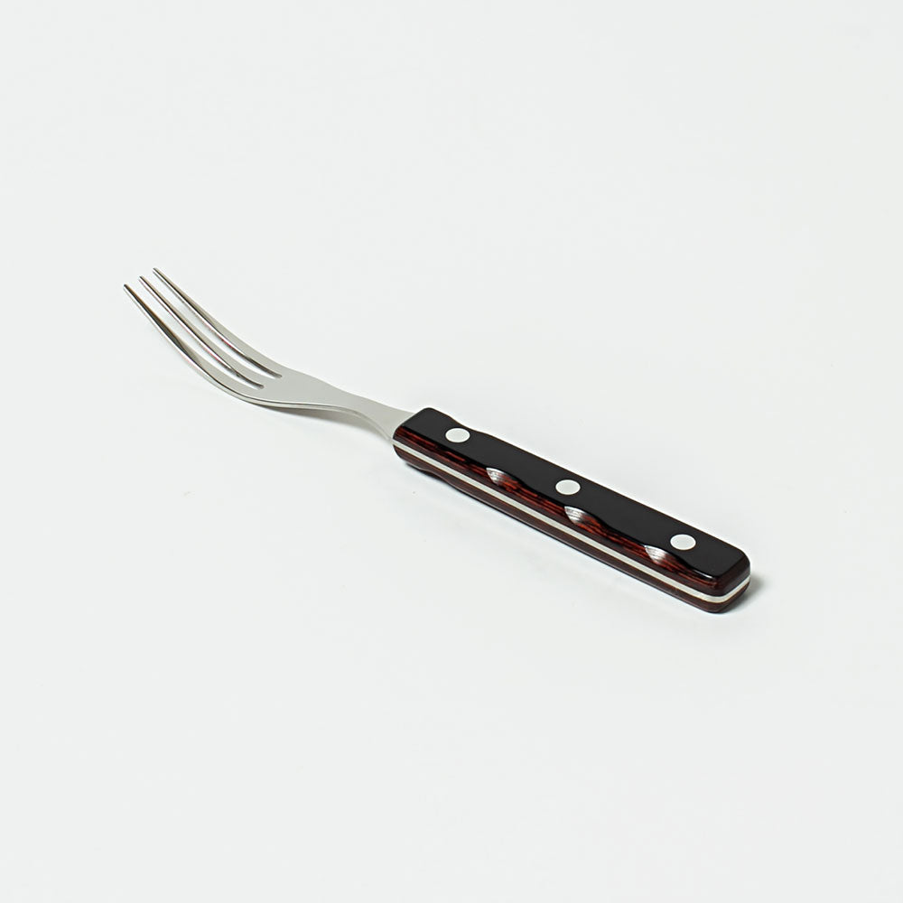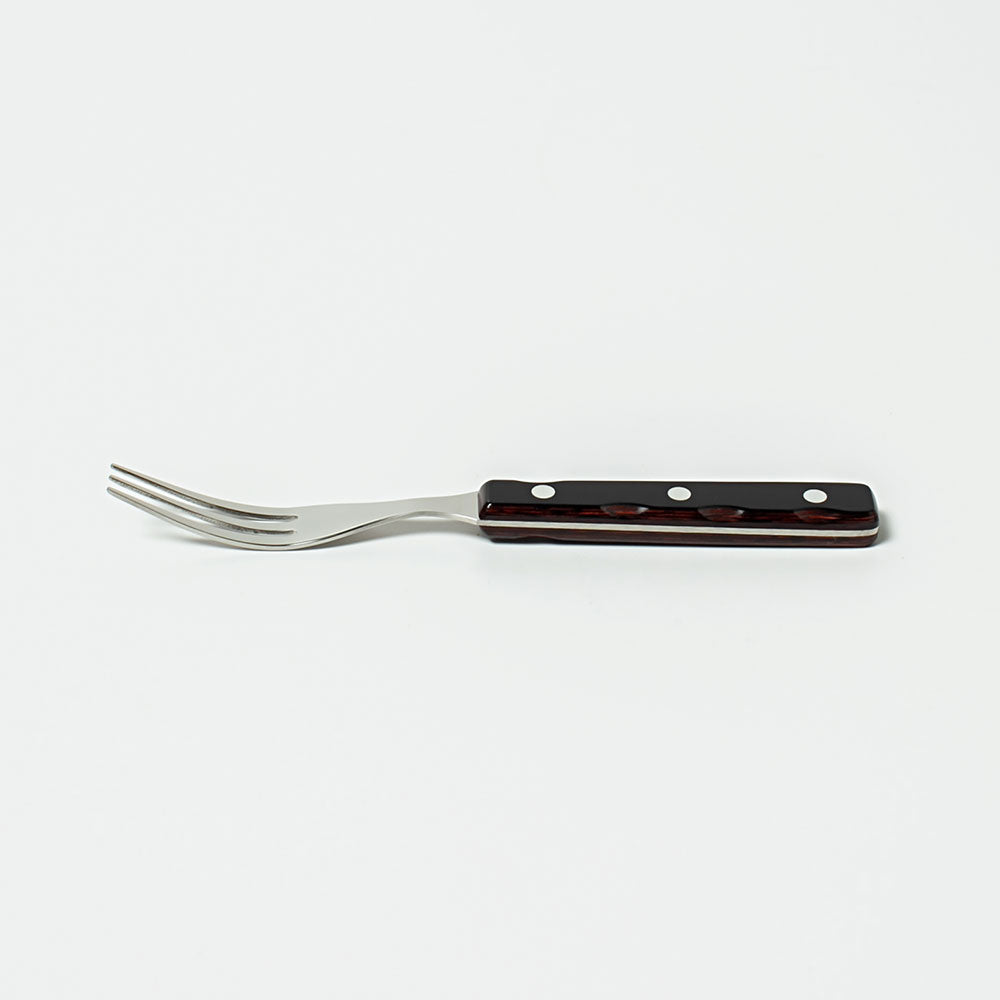 武骨さとスタイリッシュな雰囲気を合わせもつ洗練されたデザインが魅力のテーブルフォーク。 天然木を使用した味のある持ち手に、スマートなステンレスのフォルムが絶妙にマッチ。先端が長めの作りなので、肉をしっかり刺しながらナイフで安定して切ることができ、さらに絶妙な角度がスパゲッティを綺麗に巻き上げることができます。ワイルドな印象ながら、艶やかなステンレスの仕上がりや全体的にスマートなフォルムはスタイリッシュで絶妙なデザインです。ところどころカッティングされた持ち手は、手に馴染み滑りにくいように仕上げられ、使いやすさ抜群。