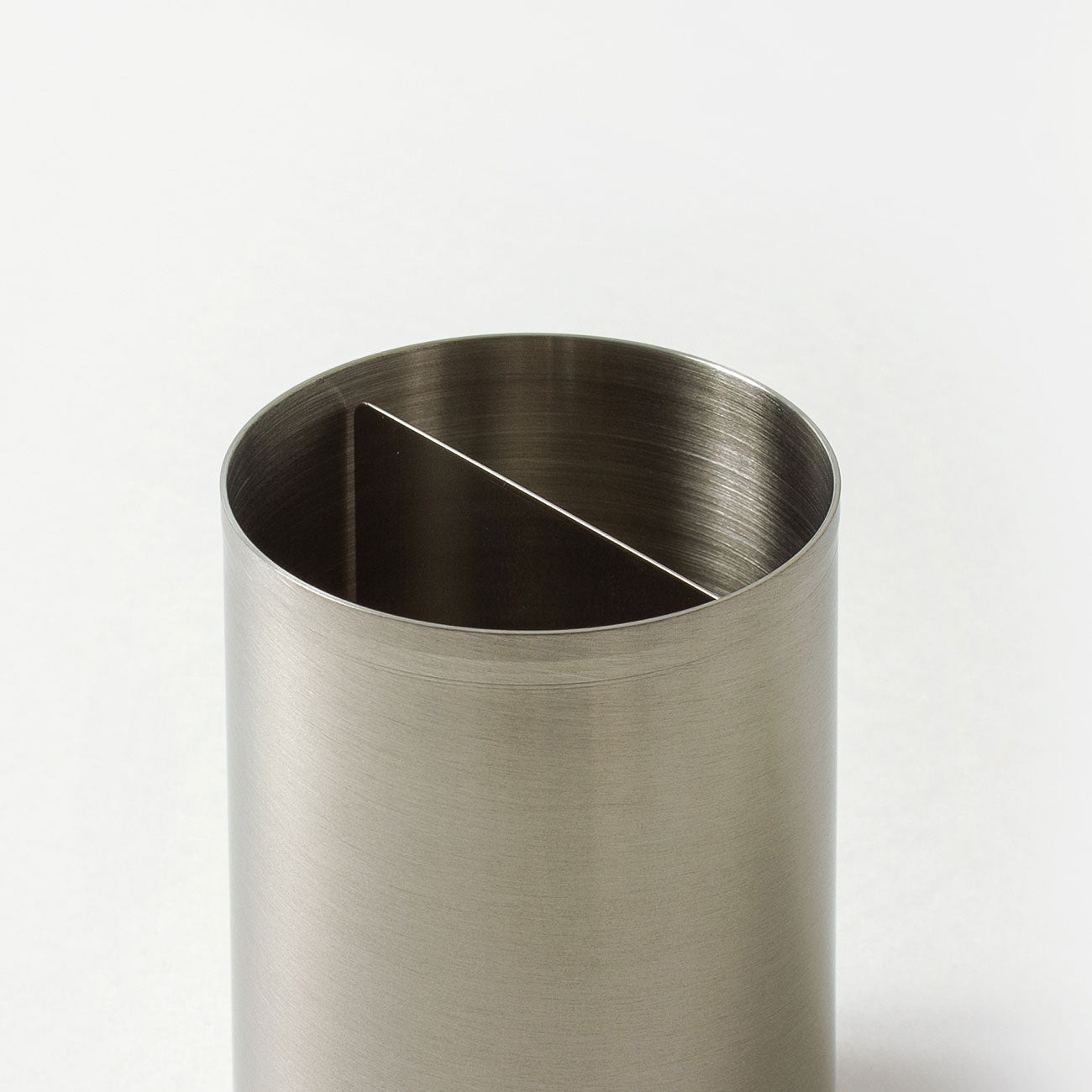 計量スプーンやカトラリーなどのキッチンツールがたっぷり(8本以上)入ります。仕切りがあるので中で絡まず、広口なので取り出しやすい。仕切りは取り出して丸洗いできます。油汚れなどもさっと落とせて、清潔を保ちやすいステンレス製。