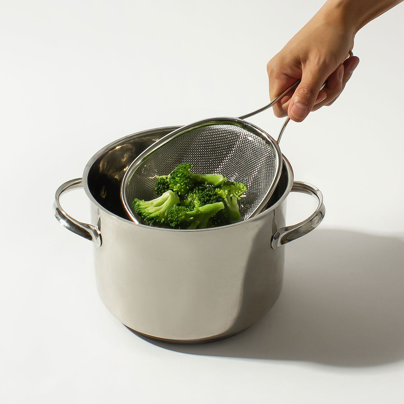 茹で野菜や麺類を一度にさっとすくえる、グローブ型のすくいザル。小さい鍋にも対応できるコンパクトサイズです。鍋の側面や底に添いやすいよう先端は平らにして、深さをつけることで食材がすくいやすくなっています。